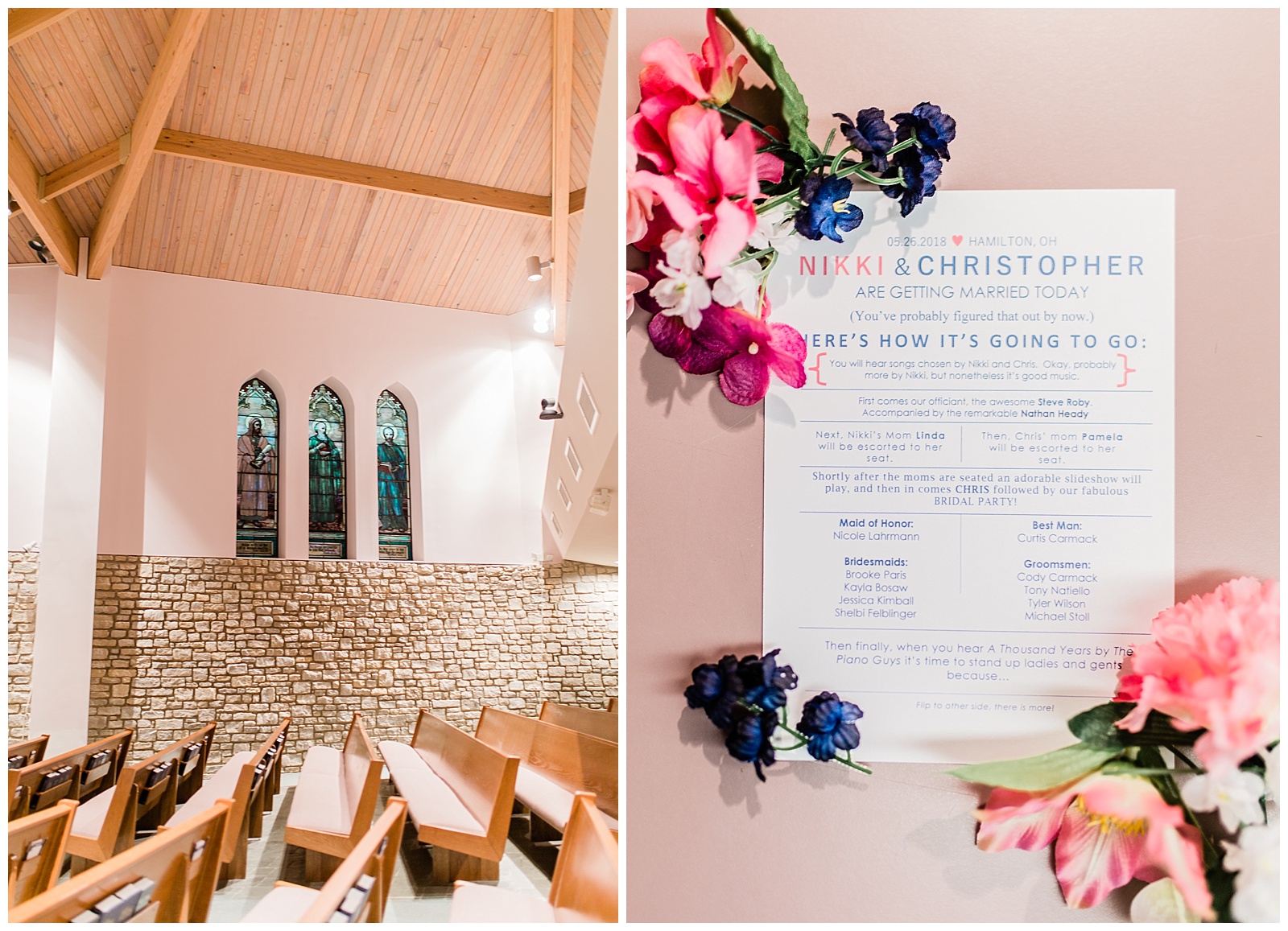Guests had made it in from the storm that was passing over, and all excitedly taking their seats in the sanctuary. More pops of blue and pinks were throughout the room. A slide show of the couples past photos played as Chris took his place in front to await his bride. Nikki and her father held on to each other for that destined walk down the aisle. Sweet vows where spoken and finally the two became husband and wife, dancing down through the guests at the procession in joy!